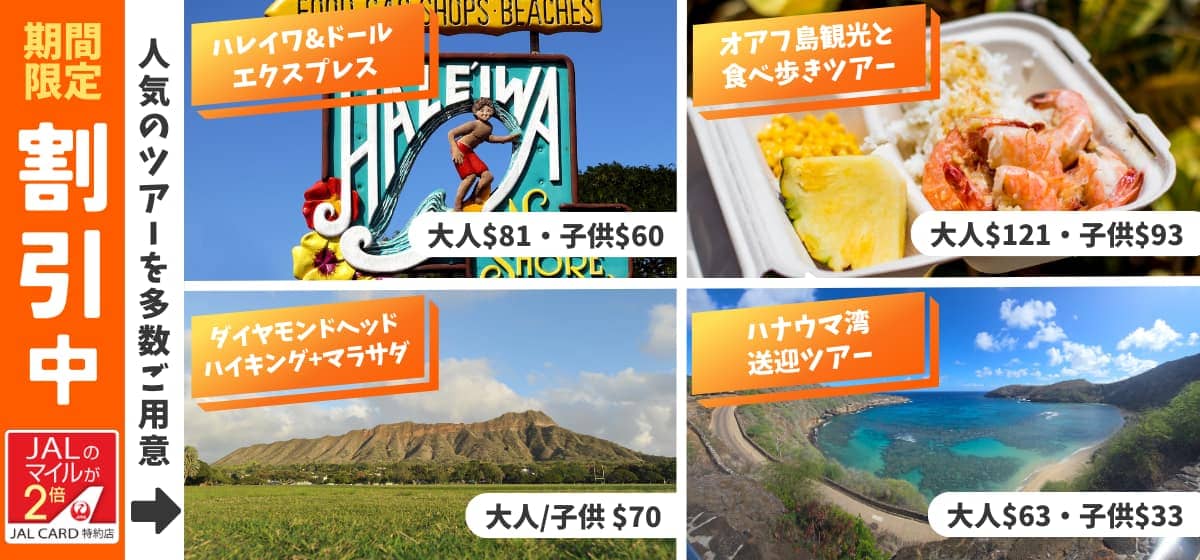 JALPAKハワイ おすすめ情報 ハワイ オプショナルツアーを検索する キーワードから検索Keyward Search 検索する 条件を指定して検索Conditions Search 島から選ぶ オアフ島 ハワイ島 マウイ島 カウアイ島 すべての島 さらに絞り込む ジャンルから選ぶ 他島ツアー サイトシーン スポーツ クルーズ ディナー&ショー グッズ/スパ他 ゴルフ お食事プラン カテゴリから選ぶ 特別価格 新登場ツアー WEB限定販売 チップ込み 車いす可(参加条件要確認) 車いすレンタル (電動) 食事付き ディナークルーズ ダイヤモンドヘッド サンドバー カイルア パールハーバー ノースショア・ハレイワ ハナウマ湾 スキューバダイビング 乗馬 イルカ クジラ ショー/エンターテインメント レンタカー 貸切チャーター フォト テーマパーク オアフ島観光 アクテビティ ハワイ島観光 カウアイ島観光 マウナケア キラウエア ヘリコプター ゴルフ 車いす不可 マッサージ/スパ 日帰り離島ツアー 出発時間帯で選ぶ 早朝 朝 午前 昼 午後 夕刻 夜 深夜 午前・午後 午後・夕刻 午前・午後・夕刻 午前・午後・夜 早朝・朝 午前・昼 夕刻・夜 朝・午前 料金で選ぶ ~$100 $101~$200 $201~$300 $301~$400 $400~ 検索する 条件をリセット Recommendおすすめオプショナルツアーのご紹介 オアフ島 ハワイ島 マウイ島 カウアイ島 もっと見る Ranking各島人気オプショナルツアー Best3 オアフ島 ハワイ島 マウイ島 カウアイ島 おすすめジャンル 他島ツアー サイトシーン スポーツ クルーズ ディナー&ショー グッズ/スパ他 ゴルフ お食事プラン カテゴリーから選ぶ 特別価格 車いす可(参加条件要確認) その他のカテゴリー 新登場ツアー WEB限定販売 チップ込み 車いすレンタル (電動) 食事付き ディナークルーズ ダイヤモンドヘッド サンドバー カイルア パールハーバー ノースショア・ハレイワ ハナウマ湾 スキューバダイビング 乗馬 イルカ クジラ ショー/エンターテインメント レンタカー 貸切チャーター フォト テーマパーク オアフ島観光 アクテビティ ハワイ島観光 カウアイ島観光 マウナケア キラウエア ヘリコプター ゴルフ 車いす不可 マッサージ/スパ 日帰り離島ツアー Hawaii StaffBLOG ハワイスタッフ厳選! スポットブログ [2026.01.29] ホノルル・クッキー・カンパニー バレンタイン限定コレクション&2月のフレーバー発売 Informationお知らせ Map集合場所マップ 集合場所一覧
