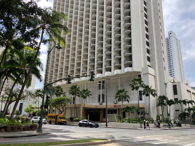 ワイキキビーチ・マリオット・リゾート & スパの2つの棟のクヒオ通り側にあるパオアカラニタワーに向かってください