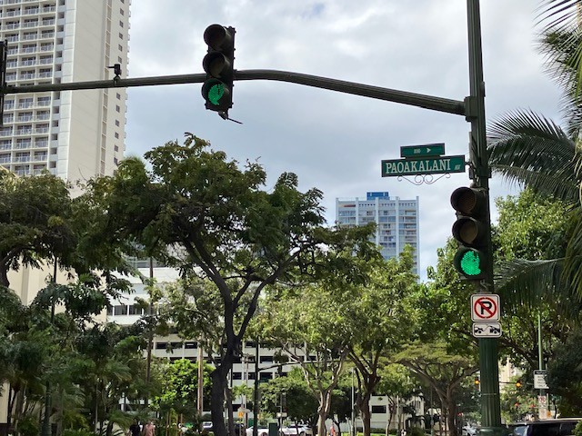 パオアカラニタワーはクヒオ通りとパオアカラニ通りの交差点の角にあります