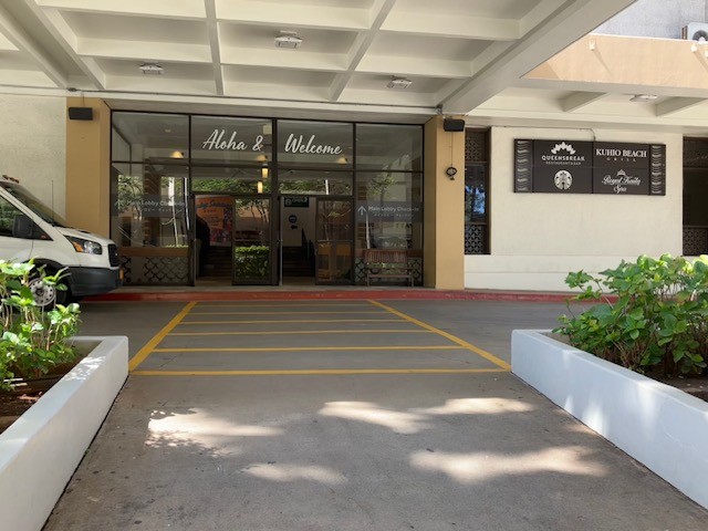 ワイキキビーチ・マリオット・リゾート & スパ パオアカラニ通り ツアーバス乗り場のホテル入り口へ向かってください