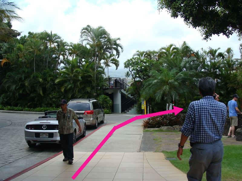 正面玄関から外に出て、右側の遊歩道にそって歩きます。