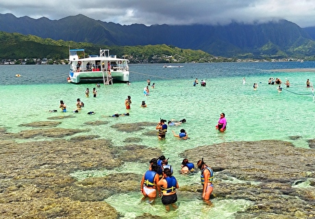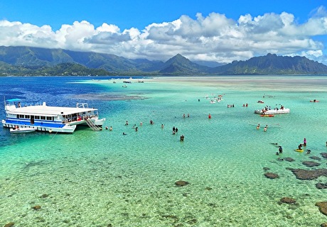 海の真ん中に突然現れる神秘的な砂浜、サンドバーに行くツアーです。綺麗な海とハワイの太陽、コオラウ山脈の絶景に囲まれてスノーケリングやマリンアクテビティを楽しんでみませんか?泳ぎが苦手な方は、船内でライブミュージックを聞きながらリラックスしてお過ごしいだくことも出来ます。午前のツアーです。