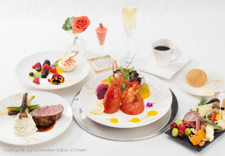 【5コースディナー】チーズ&シャルキュトリーボード - お客さまのテーブルで, ノーベスコシア産地直送メインロブスター&ビーツカルパッチョサラダ - ハワイ産野菜とエンダイブ 自家製シャンパンチャイヴヴィネグレットと共に, 季節のフルーツシャーベット, USDA最高級プライムテンダーロインビーフ - トリュフマッシュドポテトと季節の野菜, シェフのスペシャルデザート, 焼きたてのブリオッシュ、バター, 煎れたてのハワイアンパラダイスコーヒー - 特注スターカスタムコナブレンドコーヒー、マイティーリーフ - オーガニック紅茶