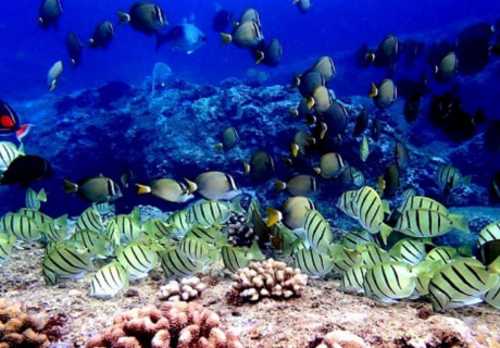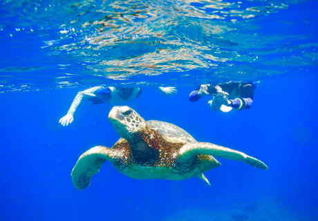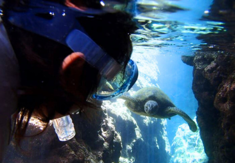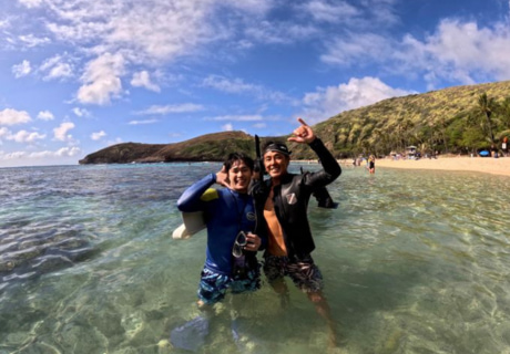 少人数制(2~6名)のセミプライベートツアーです。ハナウマ湾は浅瀬にもカラフルな魚がいます。ホノルル市発行の正規入園許可証を保有するツアーのため、入場の長い列を待つ必要はありません。長年の経験を持ち、ハナウマ湾の地形、魚や亀の生息場所を熟知したプロのガイドがご案内いたします。貸し出されるシュノーケル用具は、最新式の呼吸がしやすく水が入りにくいドライシュノーケルのため、快適にお楽しみいただけます。