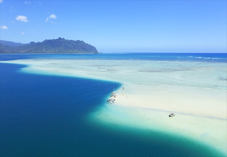 カネオヘ湾の沖にある広大な浅瀬サンドバーは「天国の海®︎」と呼び、深い海と浅い海の色のコントラストの美しい光景が広がります。キャプテンブルースは皆様を一番大きく広いメインサンドバーへお連れします。フラの聖地&ヒーリングスポットのサンドバーで、スノーケリングなどをお楽しみいただけます。ウミガメにも出会えるかも!※早目のご予約がおススメです!
